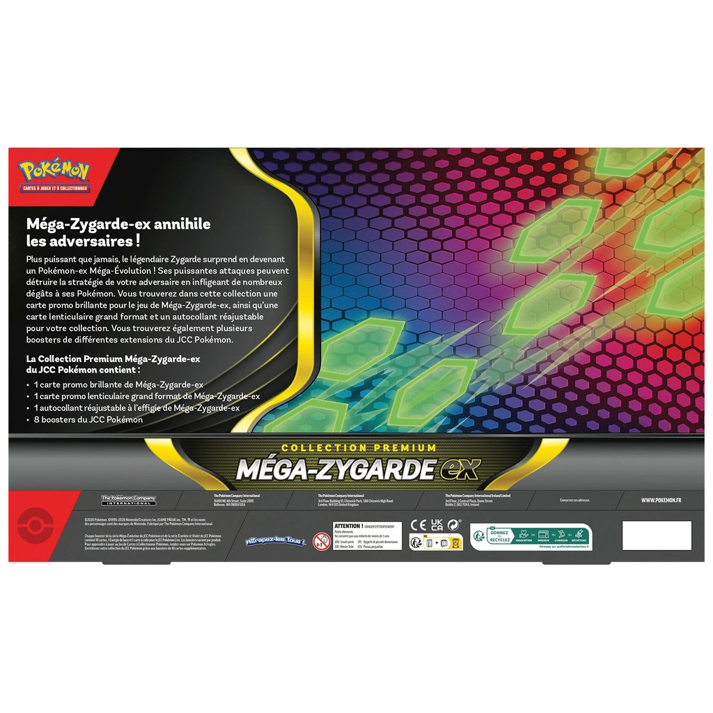 Doté de plusieurs formes et d’une puissance légendaire, Zygarde réserve bien des surprises, dont celle de pouvoir se transformer en Pokémon-ex Méga-Évolution. Décimez la stratégie de votre adversaire en infligeant des dégâts massifs grâce aux incroyables attaques de Zygarde. Vous trouverez dans cette collection une carte promo brillante pour le jeu de Méga-Zygarde-ex, ainsi qu’une carte grand format lenticulaire et un autocollant réajustable. Boostez vos parties et soutenez Méga-Zygarde-ex avec des boosters de différentes extensions du JCC Pokémon.